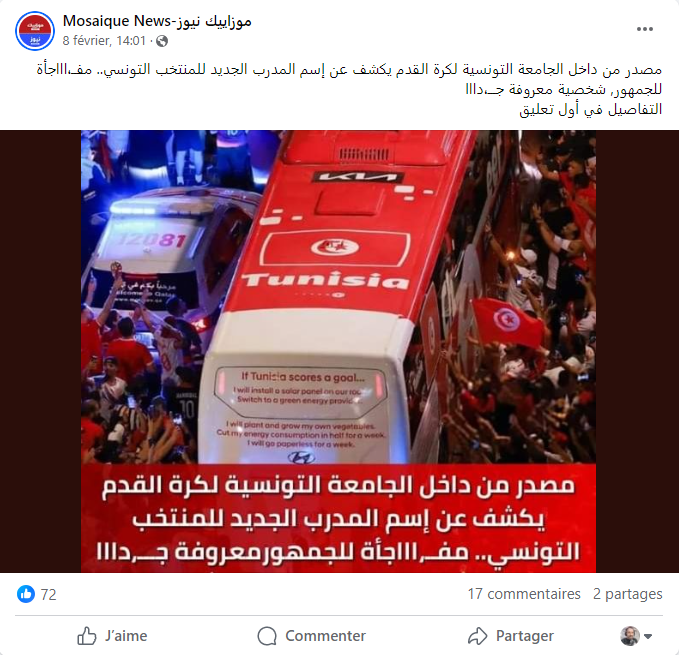 تداولت بعض صفحات الفايسبوك خبرا مفاده “مصدر من داخل الجامعة التونسية لكرة القدم يكشف عن إسم المدرب الجديد للمنتخب التونسي”.